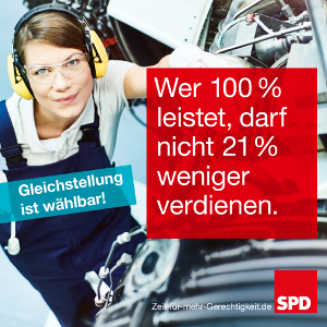 In der nächsten Wahlperiode wird die SPD an die erreichten Fortschritte anknüpfen: Das Rückkehrrecht aus Teilzeit zur früheren Arbeitszeit muss kommen. Die Lebensleistung von Frauen werden wir anerkennen und ihre Alterssicherung verbessern. Nach ersten Erfolgen bei Frauen und Führungspositionen und bei der Entgeltgleichheit gibt es weiteren Handlungsbedarf. Unser Ziel bleibt die Parität in allen Führungspositionen und ein wirksames Entgeltgleichheitsgesetz mit einem Verbandsklagerecht. Die sozialen Berufe müssen aufgewertet werden. Frauen haben für ihre Leistung genauso viel Respekt und Anerkennung verdient wie Männer. Egal ob sie noch in der Ausbildung sind oder studieren. Egal ob sie im Supermarkt an der Kasse arbeiten oder unsere Angehörigen pflegen. Und egal ob sie im OP-Saal Herzen verpflanzen oder Konzerne leiten.